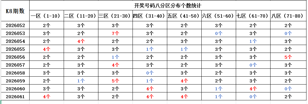 首先看上期回顾,“快乐8”第26061期开奖结果:4.5.6.7.13.18.20.21.28.32.34.39.40.42.44.47.50.56.75.76通过分析开奖号码,分享第一个数据分析:统计开奖号码的八分区冷热走势,判断出号规律。以近10期开奖号码的八分区统计数据为例: