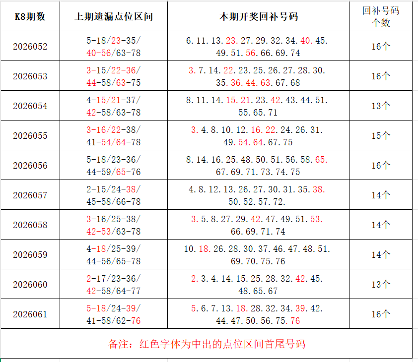 如图,上期的遗漏号码在下期开出10个左右,即为回补号码。定准点位区间首尾号码是关键!以上期2026061期为例,定位4个遗漏区间,围中16码!结合上期开奖号码,以跨度值大于或等于7为依据,本期关注2个遗漏区间:21-28/56-75;重点关注遗漏区间:3-19/22-35/41-55/63-75。点位区间号码和大底号码请勿混淆,个人分析,仅供参考。