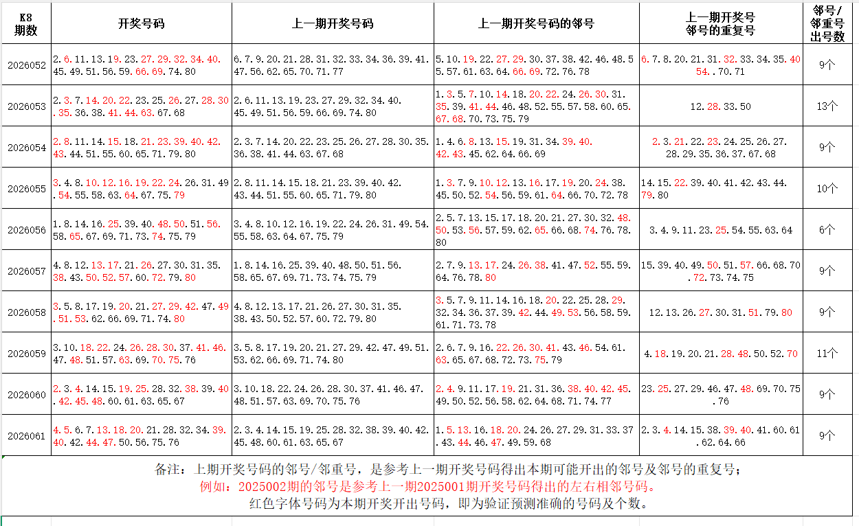 如图,红色字体是上期邻号、邻重号在下期开出,每期开出10个左右。上期邻号开出6个,邻重号开出3个本期参考邻号:3.8.12.14.17.22.27.29.31.35.38.45.46.48.49.51.55.57.74.77;邻重号:4.5.6.7.19.20.21.33.39.40.41.43.75.76;个人分析,仅供参考。
