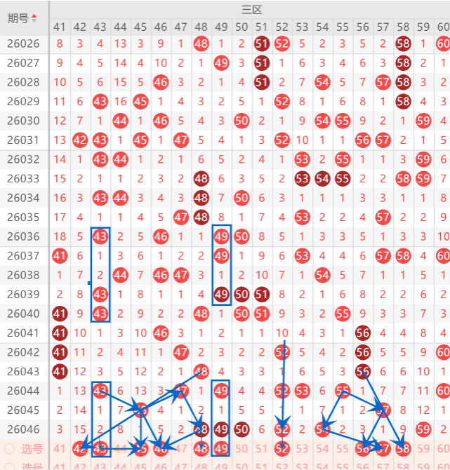 而三区的打底号是42.43.45.48.47.49.52.56.58.59中参考3-4码开出机会,