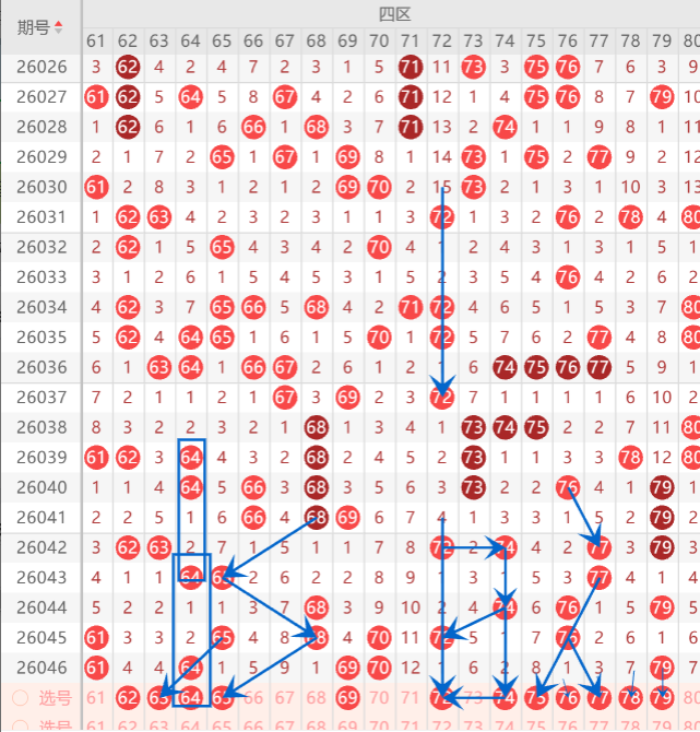 四区间的打底号是62.63.64.65.66.67.71.72.74.78.参考4-5码开出机会