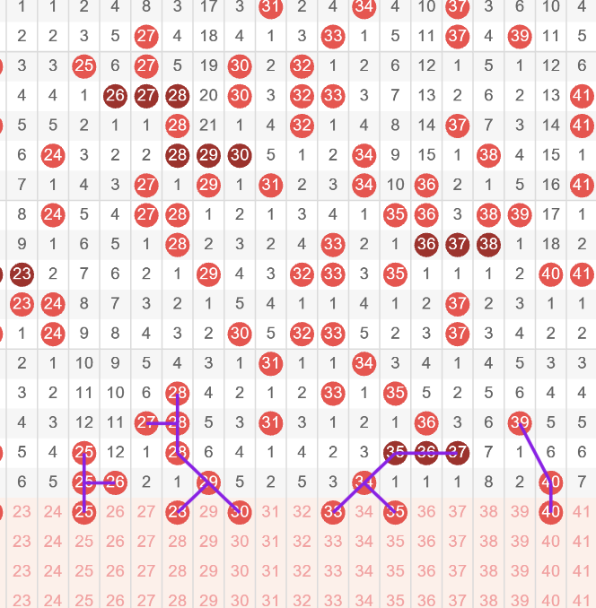 25今天这个是形态号,25   28它是一个非常漂亮的二选一点位的分边号,也有机会同时开出的,25的点位今天我比较喜欢,28  30很可能会开出一码;其中33是一个百期规律号;33  35今天关注两码组合, 是个同区间的热形态,稳妥可以选择一码当胆,33  35  39  40这里看的是有机会开出两码;