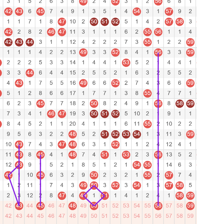 43这是一个中心对称的号,看好的直接取一码当胆;43   45看的是选一的位置非常稳,也有一点机会开出48   50二码组合,50是一个非常对称的菱形形态,56的冷号回补今天值得关注,56  59很有可能开出一码,今天4头看组合号;56    59有机会开出一到两码组合值得关注;59的座号是有机会开出的;