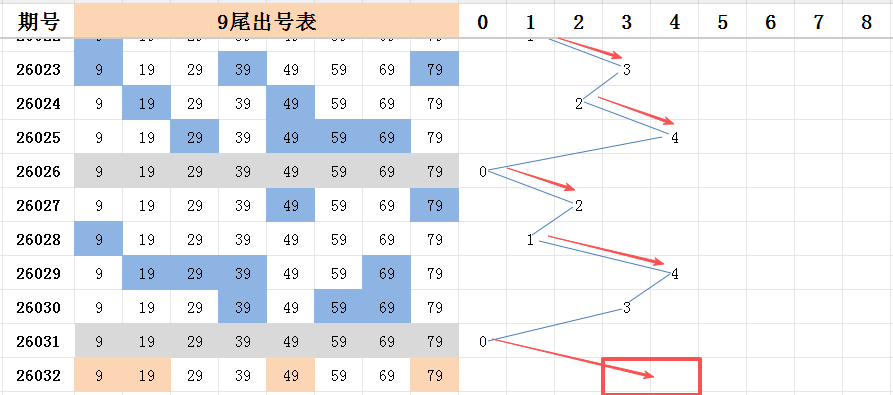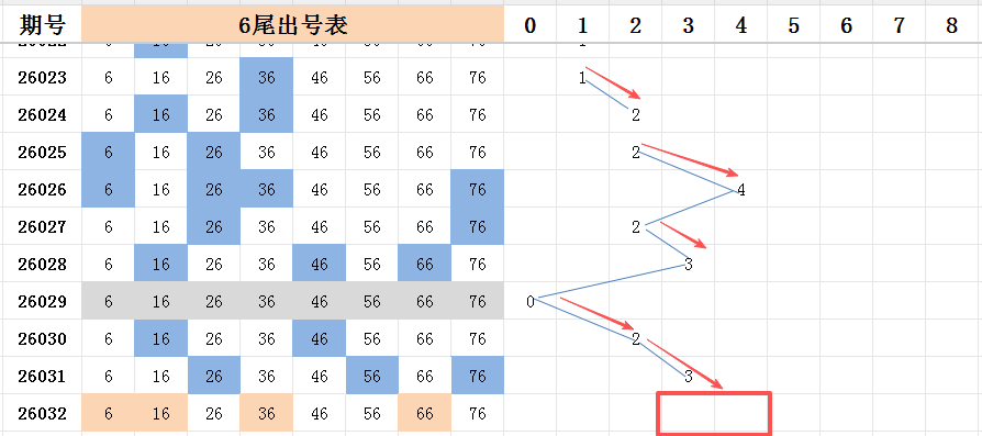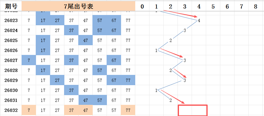 本期看好开出的范围是两码走势至四码走势之间。上期七尾开出两码走势,029期给出的三斜连号码27开出了,030期给出的四斜连号码37开出了,上期给的五斜连号码47开出了,本期还能开出六斜连的号码57吗?我没敢要,大家也可以反向操作,继续考虑斜连的号码57。