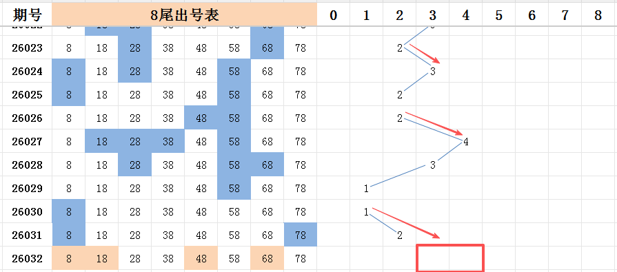 本期看好开出的范围是两码走势至四码走势之间。八尾最近两期开出的号码个数是顺延的号码走势,那么本期可以看好开出三码走势。看好号码08再次开出,走成三连号的号码走势。可以考虑8尾的两个首码号码08和号码18能开出其中一码。