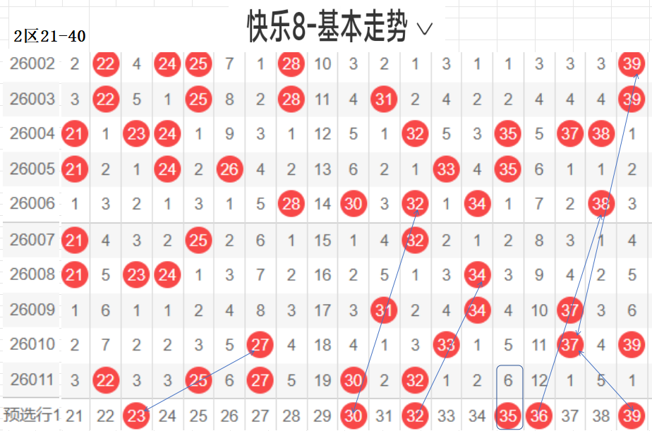 二区(21-40):遗漏5期以下有16,022 25 27 30 32  5,数据所示,冷码平均,选择条件增多了.上期开出了5个号码,出码比较分散.这期布防相应增加,重码按比例落这区较少,先给出关联码23,这个区间间接走势,温区,21-30区间上期开了4个,依旧不是重点选号区间,31-40区间开出1个,本期关注热码的回补,间隔小遗漏值最佳,3字头转热,这个小区热码注意回调,可以做关联码的布局,注重温冷码的回补.