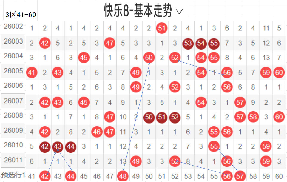 三区(41-60):遗漏5期以下有17,049 52 56 59  4,温开方式,这区码数有回暖之意,可以防一手,先定胆码走势较大者,隔期,斜三连,分边号码,可重防,间隔5以上号码可以随走势选取,例如本期大冷码,走势比较大,可以做胆,通常联动可带出,分边对称的号码,本区间也有很大走势.可关注下.隐形夹角号码.做补位形态号码.都需要观察动态走势.以上是本区间的选码方法.