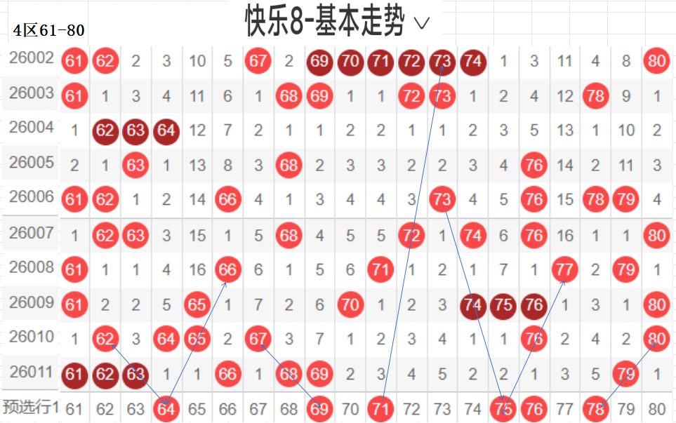 四区:(61-80):遗漏5(5)以下有20,061 62 63 66 68 69 79  7,平均温开方式,上期开出7,区间回暖,后区可防,区间从以往数据来看,重码很强,一枝独秀的存在,近期有回补走热的趋势,区间回暖,本区间后区可防,与一区相比,也是温区.,对称下落,隔期回补码,可以防,这区对呈对称三角关系的胆码,斜三连有走势的胆码,联动落位码,都有各自的走向落位关系,根据走势选择一种方式选码.