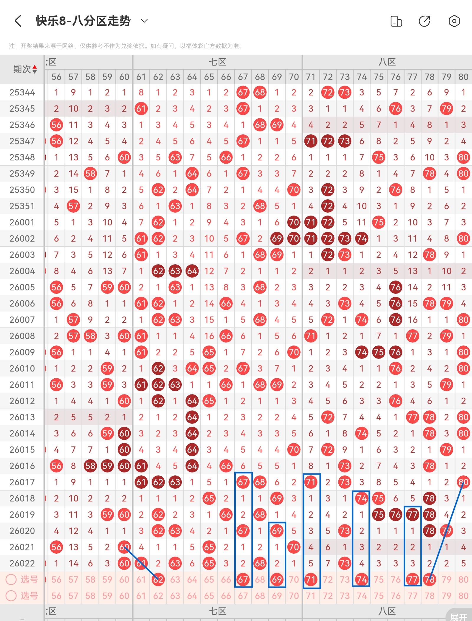 四区间上期(26022期)开出了五码,区间整体走出了温态出号形势,前区〔61-70〕开出了四码(61 63 65 68)开出了分边号码和独码和重号,本期做号需要注意重号和斜连走势号码能否开出,以及独码位置能否有落码和空白区域号码回补落码,后区〔71-80〕开出了一码(73)开出了独码,本期做号需要注意独码位置能否有落码,以及空白区域号码回补落码,区间由冷态走出温态出号形势后,本期大概会是温态出号形势,号码个数预计五个左右,个人看好【62 67 69 71 74 77 78】重点关注【62 69 74 77 78】