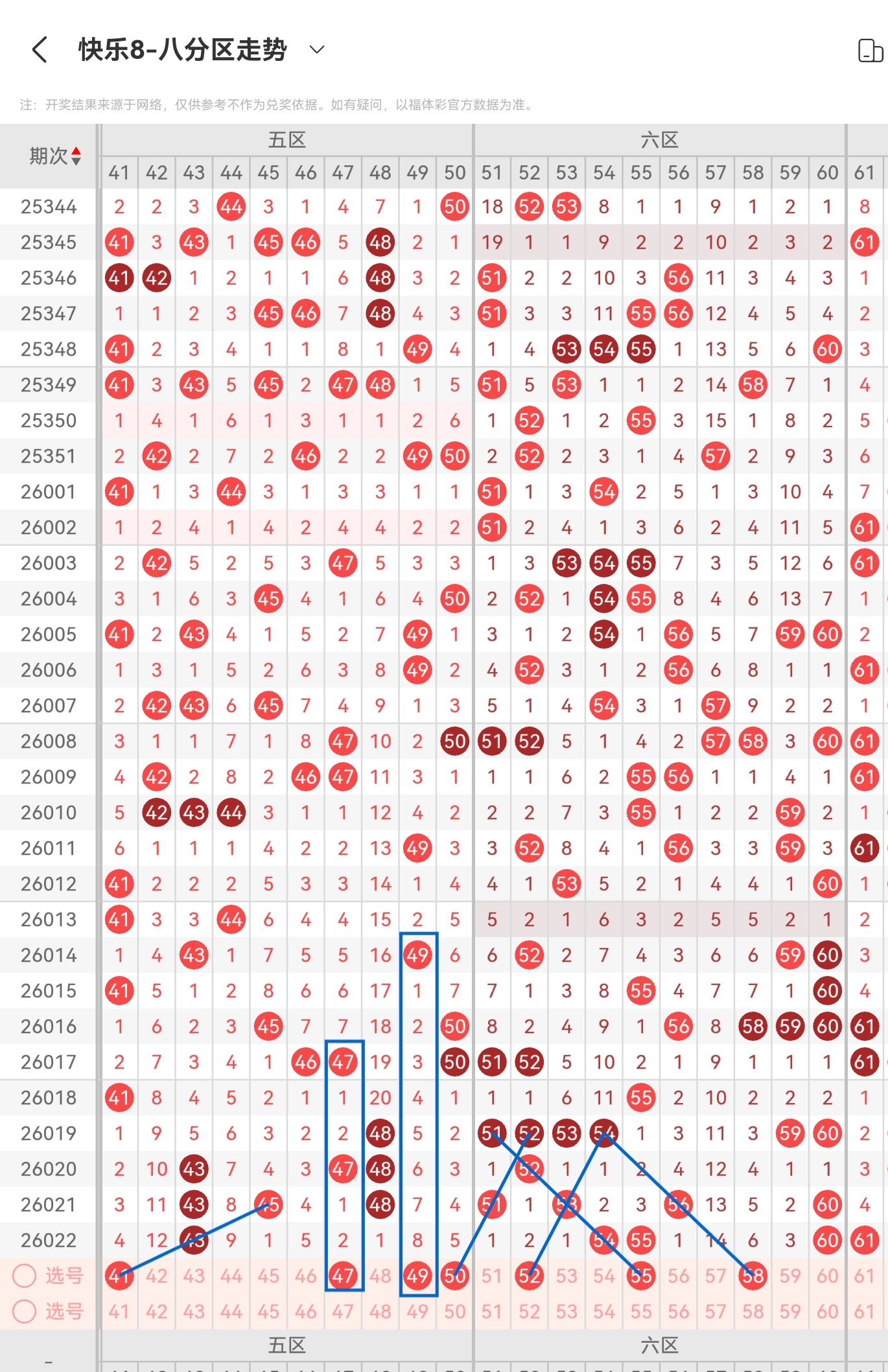三区间上期(26022期)开出了四码,区间整体走出了冷态出号形势,前区〔41-50〕开出了一码(43)开出了重号,本期做号需要注意重号能否继续开出,以及空白区域号码回补落码,后区〔51-60〕开出了三码(54 55 60)开出了连号和重号,本期做号需要注意重号和斜连走势号码能否开出,以及空白区域号码回补落码,区间由热态走出冷态出号形势后,本期大概会是温态出号形势,号码个数预计五个左右,个人看好【41 47 49 50 52 55 58】重点关注【47 49 50 52 58】