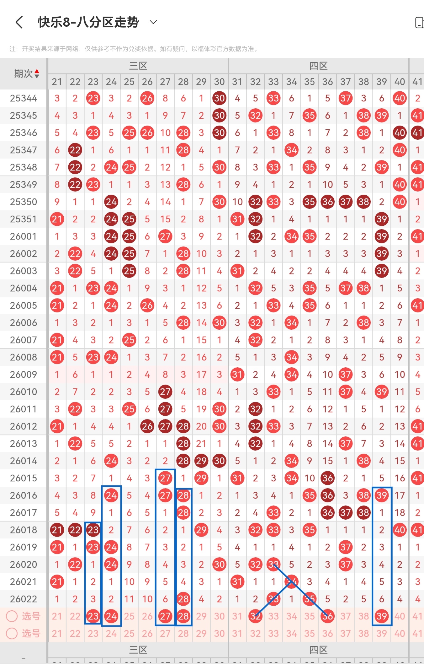 二区间上期(26022期)开出了三码,区间整体走出了冷态出号形势,前区〔21-30〕开出了一码(28)开出了独码,本期做号需要注意独码位置能否有落码,以及空白区域号码回补落码,后区〔31-40〕开出了两码(33 35)开出了分边号码,本期做号需要注意斜连走势号码能否开出,以及空白区域号码回补落码,区间连续走出冷态出号形势后,本期大概会是温态出号形势,号码个数预计五个左右,个人看好【23 24 27 28 32 36 39】重点关注【23 24 27 32 39】