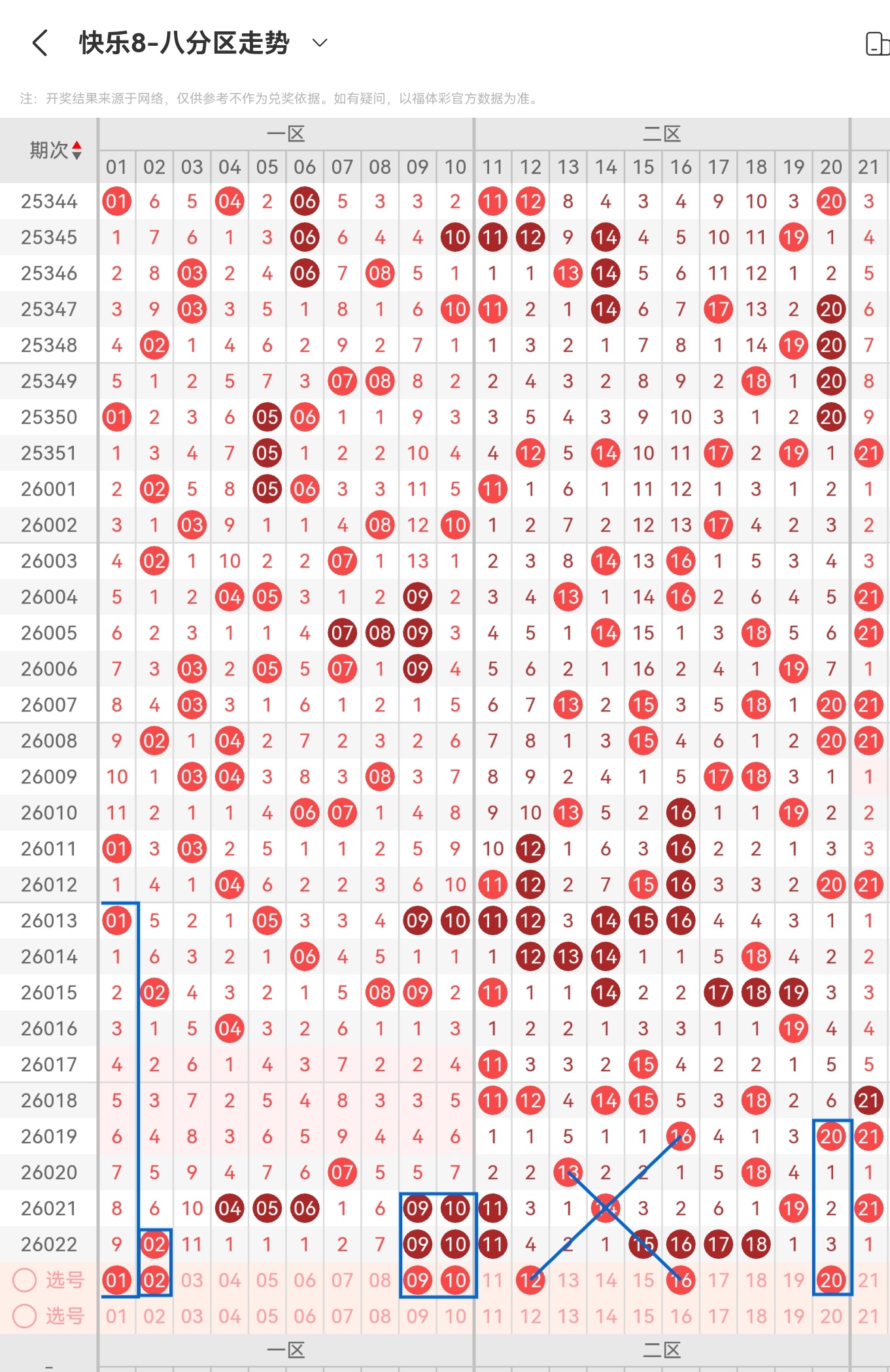 一区间上期(26022期)开出了八码,区间整体走出了热态出号形势,前区〔01-10〕开出了三码(02 09 10)开出了独码和连号带重号,本期做号需要注意重号和斜连走势号码能否开出,以及独码位置能否有落码和空白区域号码回补落码,后区〔11-20〕开出了五码(11 15 16 17 18)开出了重号和连号,本期做号需要注意重号和斜连走势号码能否开出,以及连号位置如何落码和空白区域号码回补落码,区间连续走出热态出号形势后,本期大概会是温态出号形势,号码个数预计五个左右,个人看好【01 02 09 10 12 16 20】重点关注【02 09 12 16 20】