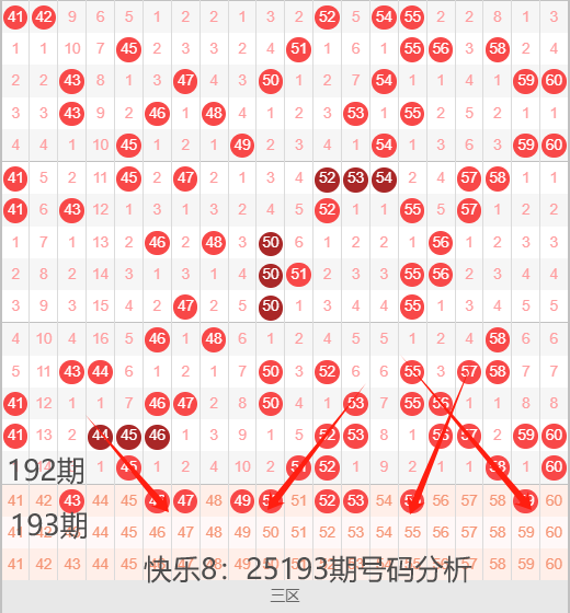 上期该区间开出号码:45 51 52 58 60,10个号码球,区间呈现热开,区间整体上目前是在热开的周期,号码出号近期也比较平均,分布相对与其他大区间来说很均衡,本期二区间个人预选号码:43 46 47 49 50 52 53 55 59,43号是遗漏3期号码,46号是遗漏间隔1期对称状态,三斜连走势,47号是遗漏间隔2期的对称状态,49号是遗漏10期的号码,50号是四斜连落位走势,遗漏2期的状态,52号本期三重码的机会,53号是遗漏1期的号码,55号是遗漏2期的号码,均线三斜连走势,59号是梅花状态,五斜连落位点,通过以上分析,三区间终选号码:43 46 50 52 53 55 59 。
