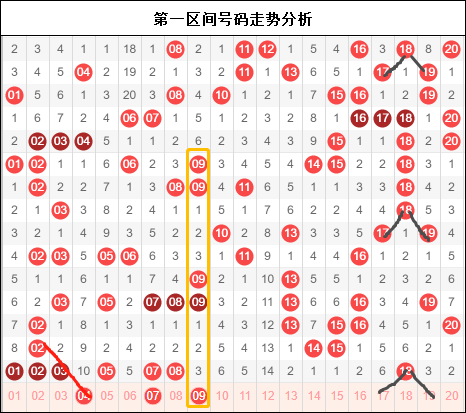 第一区间号码01-20,一区昨晚防守八码中出六个号码。一直以来在这里布局的01-08这一次终于加码了,可惜这里没有出现过八码。如此聚集的号码出现以后,336期对于我们来讲,这里不见得是好事了。一个是近期前面走势的参照,一个是本期走势的残缺对我们分析新的一期走势存满了不确定性。这里唯一比较看好的号码就是18这里,本期会分解出两种走势,要么重号要么分号。但是本区在这一期里无疑会是减码的一期。