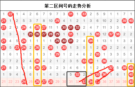 第二区间号码21-40,二区同样存在的三角形也是没有走出来,不过好在这里近几期连号没有断过。这间接说明走势还在,还可以在这里发挥一下我们的想象。好在这里昨晚开奖出现了邻号,那这里不妨按照两个思路分析。一个是邻号这里走出我们想要的走势,如果这里走不出的话那另一个就是单号32这里继续接力。当然前半段还是要考虑的,这里必然还会有走势冲出重围。