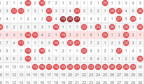 上图是福彩快乐8开奖号码走势分布图其中一部分,我在上面走势图中标注出来的数字一共有15个,这15个数字上期是一个数字都没出现过,最近两期也只出现了3个数字,那么本期可以关注这个区域的数字出4个或者5个,个人最看好数字15 16 17 19 21 22 23 24;