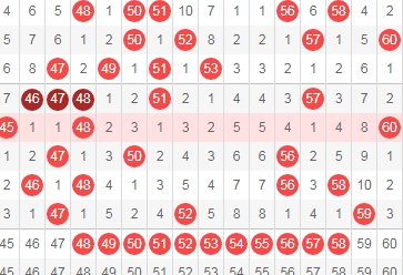 上图是福彩快乐8开奖号码走势分布图其中一部分,我在上面走势图中标注出来的数字一共有11个,这11个数字上期只开出了一个数字52,最近两期也只出现了4个数字,那么本期可以关注这个区域的数字出3个或者4个,个人最看好数字48 50 52 54 57 58。