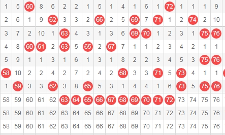 上图是福彩快乐8开奖号码走势分布图其中一部分,我在上面走势图中标注出来的数字一共有10个,这10个数字上期只开出了一个数字65,最近两期也只出现了3个数字,那么本期可以关注这个区域的数字出3个或者4个,个人最看好数字63 65 67 69 71。