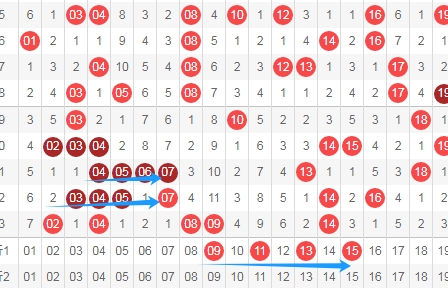 上图是福彩快乐8开奖号码走势分布图其中一部分,我在上面走势图中标注出来的数字09 11 13 15这里这个图形,和上面走势图中标注出来的横向蓝色箭头组成的图形是不是很相似呢?上面蓝色箭头可以看03 05 07这里可以看09 11 13 15,那么本期可以关注09 11 13 15这里出号码。