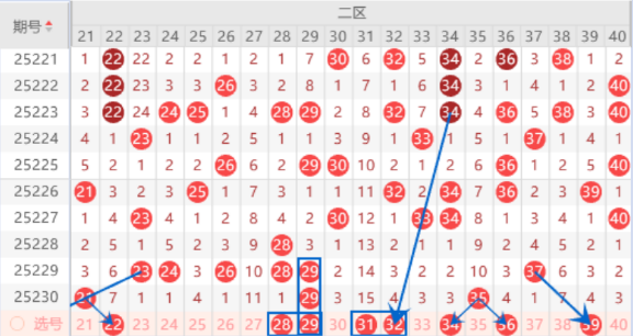 该区间的连号空一带号23 24 26号数字上期没能开出重号来,本期我们注意一下落下一个号码的情况,本期的25 27号数字也是要防守一下落下一个号码的情况。本期的28号数字我们注意一下出号情况,本期可以防守一下28 31号数字或者28 29号数字同出的情况。本期的33 34号数字我们注意出一个号码的情况,其中的34号数字可以重点关注一下出号情况。本期的39 40号数字我们注意出一个号码的情况期,其中的39号数字我们可以重点关注一下。