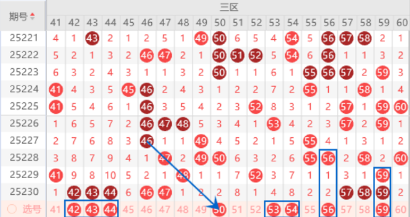 该区间上期开出了42 43 44号数字的三连号,本期我们注意一下出重号的情况,其中的43 44号数字可以重点关注一下。本期的50号数字我们注意出一个号码的情况,属于断斜连号码,出号机会是有的,本期可以防守一下50 58号数字同出的情况。本期的53 54号数字我们注意出一个号码的情况,其中的54号数字可以重点关注一下。三连号57 58 59号数字我们也是要注意出重号的情况,其中的57 59号数字可以重点关注一下出号情况。