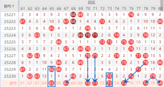 该区间的65号数字我们注意一下出号情况,本期可以防守一下65 67号数字同出的情况。本期的70 71号数字我们也是要注意落下号码的情况,其中的71号数字可以重点关注一下,本期可以防守一下71 73号数字或者67 71号数字同出的情况。本期的73号数字我们注意出重号的情况,本期可以防守一下73 80号数字同出的情况。上期开出了79号数字,本期我们注意一下走分边的情况,所以本期的78 80号数字我们注意一下出号情况。