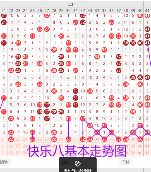 我们来看下二区的基本走势情况,上期开出了六枚开奖号码,本期预测开出4-5枚开奖号码,首先我们来看22 25 28同路三码开出,优先考虑重号一枚。遗漏二期的27 39 32考虑一枚,33 35 37三码的交叉走势建议考虑一枚。38 40 42的交叉走势建议考虑一枚。