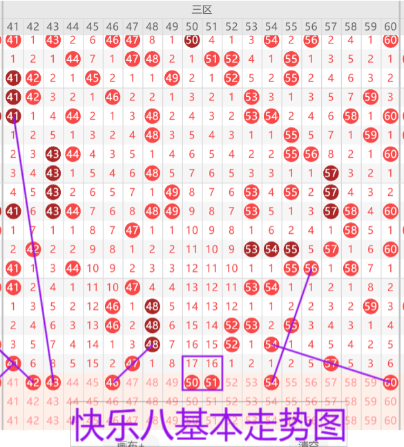 我们来看下三区的基本走势情况,上期开出了三枚开奖号码,本期预测开出5-6枚开奖号码,首先我们来看42 的三斜连走势。43的三斜连走势空六期。可以考虑42 43双码二连。46的三斜连。50 51双冷码考虑一个。54的三斜连。60的同路三斜连,54 60可以考虑同出。