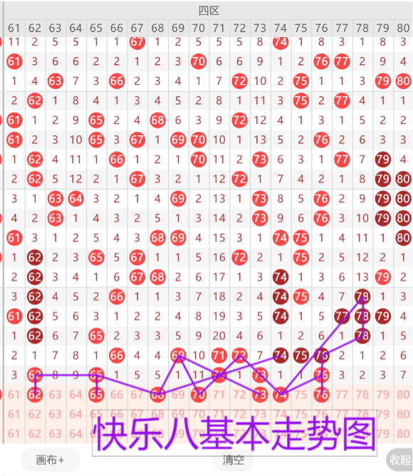 我们来看下四区的基本走势及情况,上期开出了五枚开奖号码,本期预测开出4-5枚开奖号码,首先我们来看同路的62 65再次开出可以考虑重号一枚。69的隔期分边68 70二选一。73 76重号二选一。选73可以考虑73 74二连形态。
