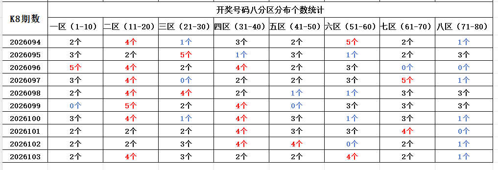 首先看上期回顾,“快乐8”第26103期开奖结果:4.6.11.13.15.20.25.27.30.34.35.45.48.52.54.57.60.64.67.80。通过分析开奖号码,分享第一个数据分析:统计开奖号码的八分区冷热走势,判断出号规律。以近10期开奖号码的八分区统计数据为例: