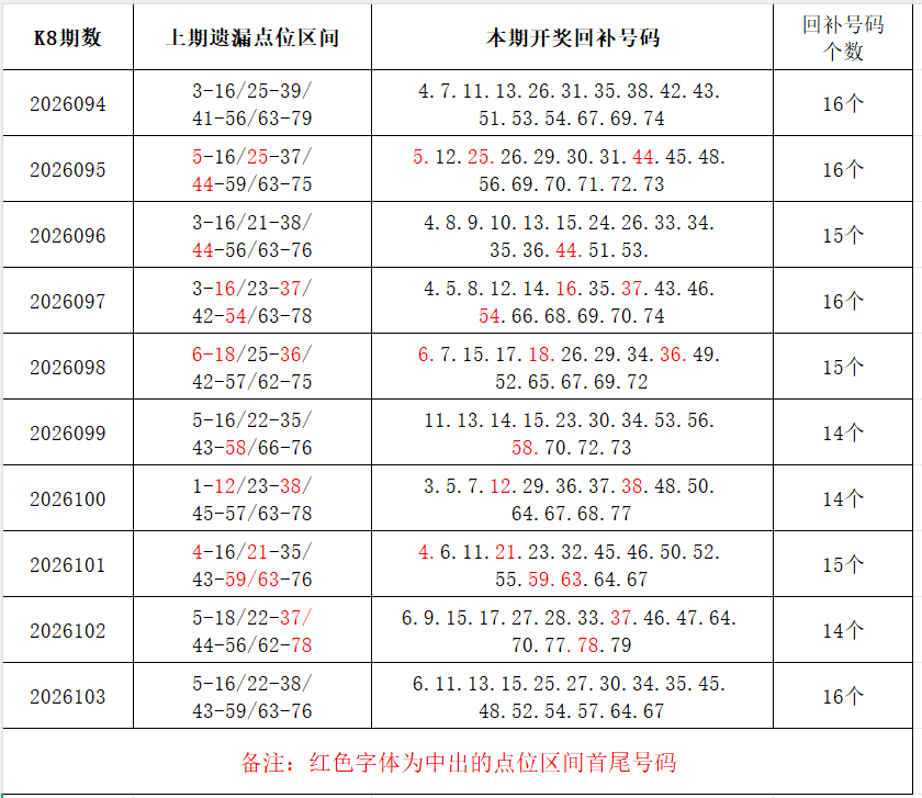 如图,上期的遗漏号码在下期开出10个左右,即为回补号码。定准点位区间首尾号码是关键!以上期2026103期为例,定位4个遗漏区间,围中16码!结合上期开奖号码,以跨度值大于或等于7为依据,本期关注2个遗漏区间:35-45/67-80;重点关注遗漏区间:5-16/24-36/44-58/63-79。点位区间号码和大底号码请勿混淆,个人分析,仅供参考。