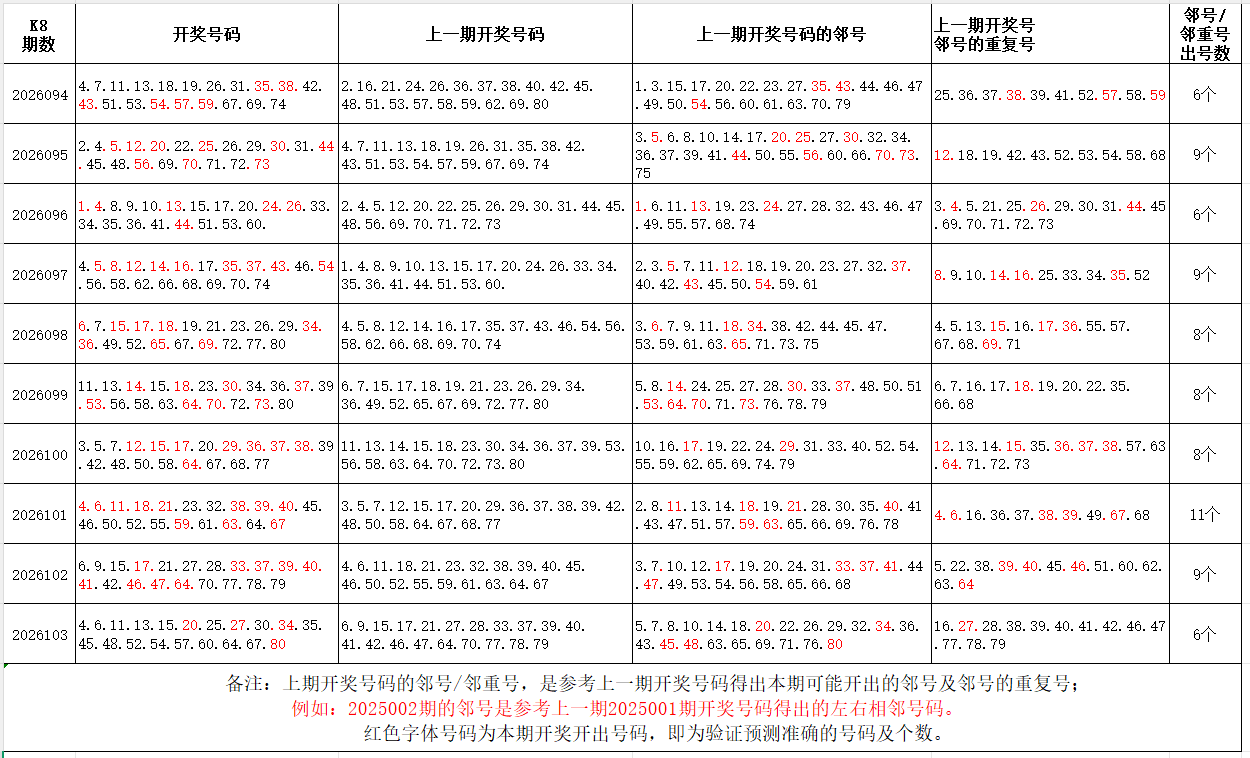 特别提示:关于邻号和邻重号的数据统计,邻号,是指上期开奖号码的左右相邻号码;其中重复出现的邻号,即为邻重号。一定要区分,邻重号不是上期开奖号码的重号,是邻号里的重号。可能新关注的粉丝,还不适应这种统计方法。熟能生巧,无它。统计方法不同,得到的数据结果不同。个人分析,仅供参考。