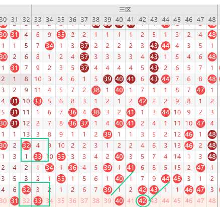 三区胆尾3尾看好33,3尾近期冷号全出,而且隔三期号近期出现多次,今天只有33 48看好33,不喜欢33就试试48,42形态上比较好看上图已经勾画,近期有三斜连形态出现,我们可以跟一期,42也可以当重号防守一期,今天边号38 40 41 42 43 44 45 46 47 48要出号,看好45,隔一期出现二期接着跟一期45,本期三区关注四码33 42 45 48
