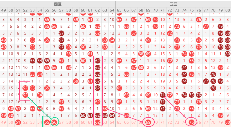四区胆尾2尾5尾,锁定52 55,2尾最热今天62最合适选,不看好62试试同尾号52,要在热区选热尾思路不能错,5尾近30期最大期数隔4期就出,今天55可以,重号,边号出现2期今天接着看边号重号,0尾1尾连出2期,那就看51 60 61,形态上56是三直落形态上图已经勾画,防隔5期号59本期四区关注五码51 59 55 61 62