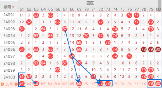 上期开出了61 62号数字,本期我们注意一下出重的情况,重点关注一下61号数字走重的情况,本期可以防守一下61 63号数字同出的情况。本期的69号数字我们关注一下出号,属于长斜连号码,出号机会是有的。上期开出了78 79号数字的重号,本期我们注意出一个三重的情况,可以重点关注一下79号数字走三重的情况,防守一下79 80号数字同出的情况。