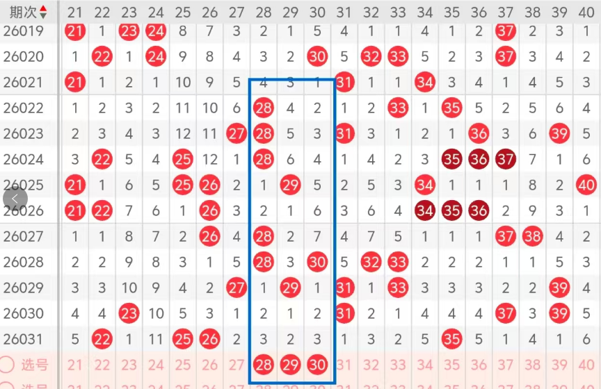 第二区间的走势分析:第二区间上期开出了四个号码球,主要的落号点位在二区间的前半区,走出了两奇两偶的形态走势,上期二区间的前半区落下了三个号码球,后半区落下了一个号码球,整个二区间处于走冷的趋势,根据二区间的走势规律,今天的二区间我们主看二区间冷码的回补,主看前半区凤尾处28 29 30这三个号码球的落位,今天落下的机会很大,28 29都走出了斜连码的走势,30是大冷码的回补,这三个号球建议大家打个三胆拖,或者打个三码复二比较稳妥,参考为主!