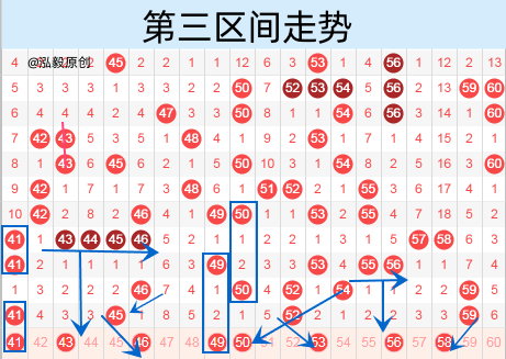 四连号43 44 45 46号前两期分别落了45 46号,那么本期43 44号我们要注意了,落下一个号码的情况还是很大的。49 50号数字我们可以关注一下,出2连的机会非常大。连号空一带号53 55 56昨天直播间就说过了,要断号,我们等今天再来做号,那么本期我们在这里是可以定一胆码出来的。连号57 58的落号情况我们也是要关注的。