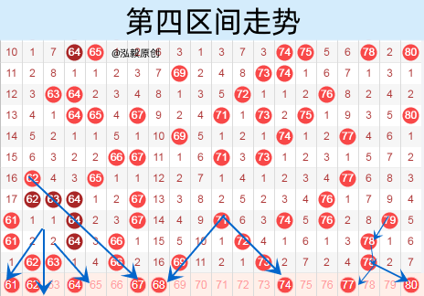 该区间的堵门62 63上期两个都出来了,可惜我们只抓了一个,那么本期我们就要注意继续落重号的情况了。61 64这两个号码我们也是需要注意一下的。本期遗漏16期的两个号码应该会开出一个来,我们要抓一抓了,不能在放了。74是属于4斜连号,我们可以关注一下。上期开出了73 78,那么本期的76 80号也是值得我们关注的。