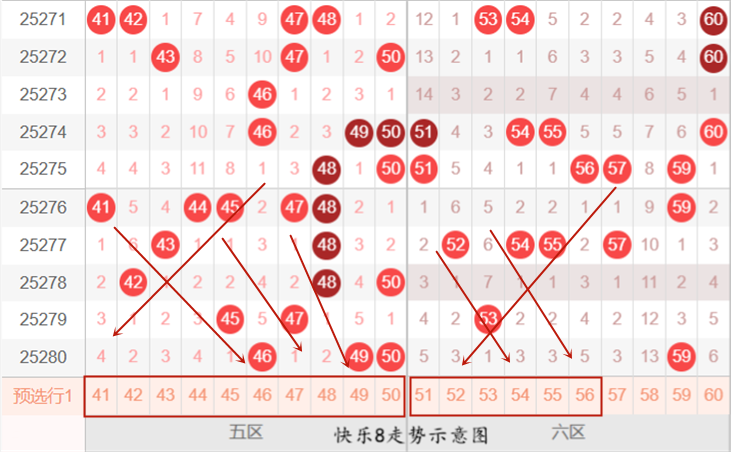 第五区间,上期开出三码,目前此区间处于热区,根据走势分析预计本期此区间将分散开号,预计将出现走冷趋势。