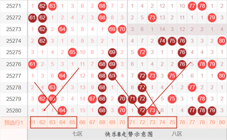 第七区间,上期开出三码,目前此区间处于大热区间,根据走势分析预计本期此区间将在前中端开号,预计将出现走冷趋势。