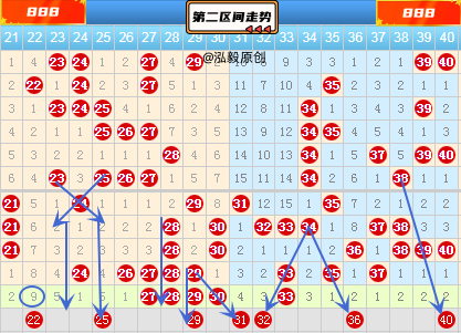 该区间上期又开出了一个四连号,有点难做号,这里太过热,是否预示着陷阱要来了呢。本期我们要注意一下中心对称23 24 25号的回补,上期23 25没能回补,本期有机会回补出一个号码的。其次就是四连号27 28 29 30号我们也要注意一下它的落号情况。32 36都是以34为头形成的三斜连,本期我们要注意出一个的情况。