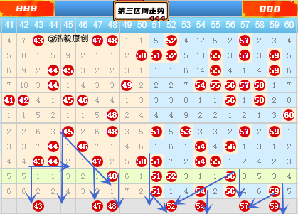 该区间的连号43 44我们要注意一下落号的情况,4斜连号45 46 47 48号我们也要注意一下它落号的情况,预计本期开始会连续落号下来。上期开出了3重号51号,本期我们需要防守它出4重号的可能,最近四重号和三重号出的比较频繁,不得不注意。