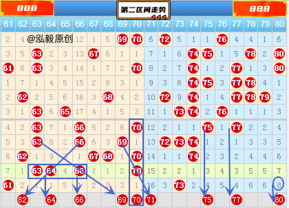 该区间上期只开出了2个号码,会不会像前面一区一样来个大爆发呢?这个我们要防守一下。连号空一带号63 64 66上期没能落重号下来,本期我们要防守出现回补的情况,这里可重点考虑。连号空一带号67 68 70在落了70号重号之后就断号了,本期我们也是要防守回补号码的出现的。连号78 79已经同时遗漏了6期了,连号41 42也是这样的,本期这里我们要注意开出2个号码的情况。
