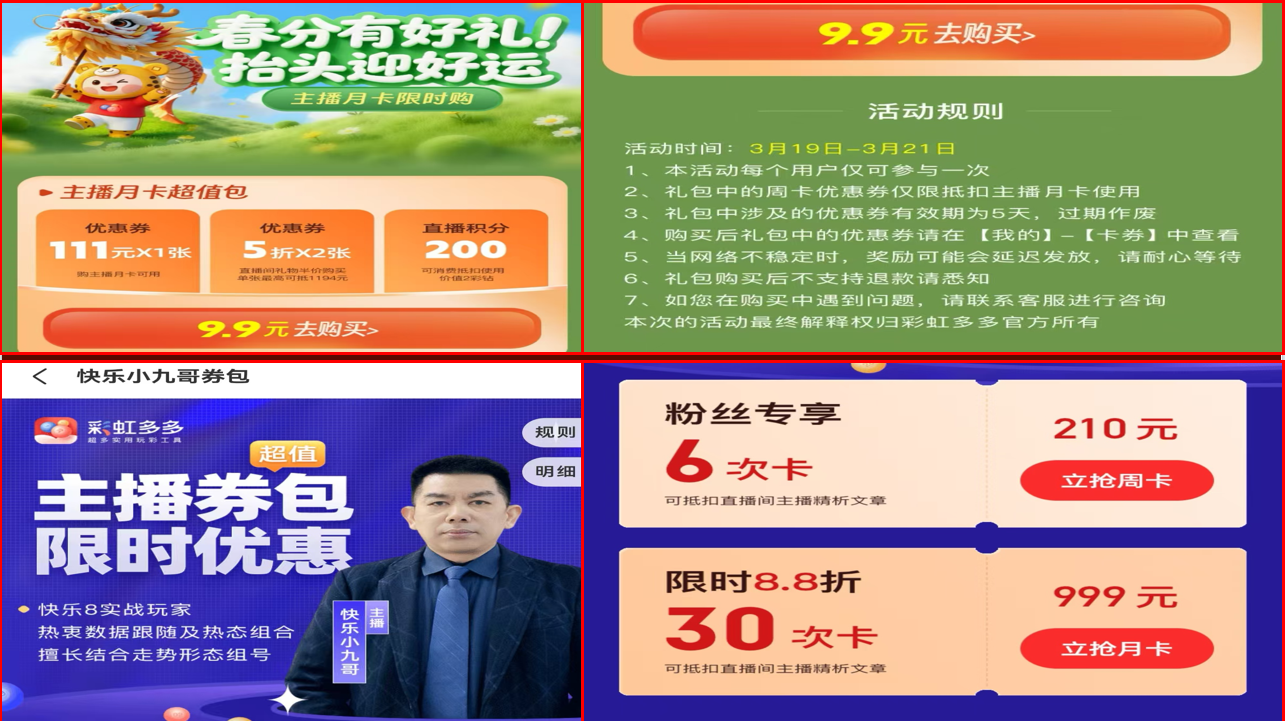 温馨提示:跟车做好计划,不要掉队,不然容易错过大奖!建议购买周卡、月卡跟随九哥一周或一个月看结果!周卡210元,6张免单卷,有效期10天;月卡999元,30张免单卷,有效期35天,可省150元!感谢大家对九哥的信任与支持!九哥定不负众望!切记,理性参与!