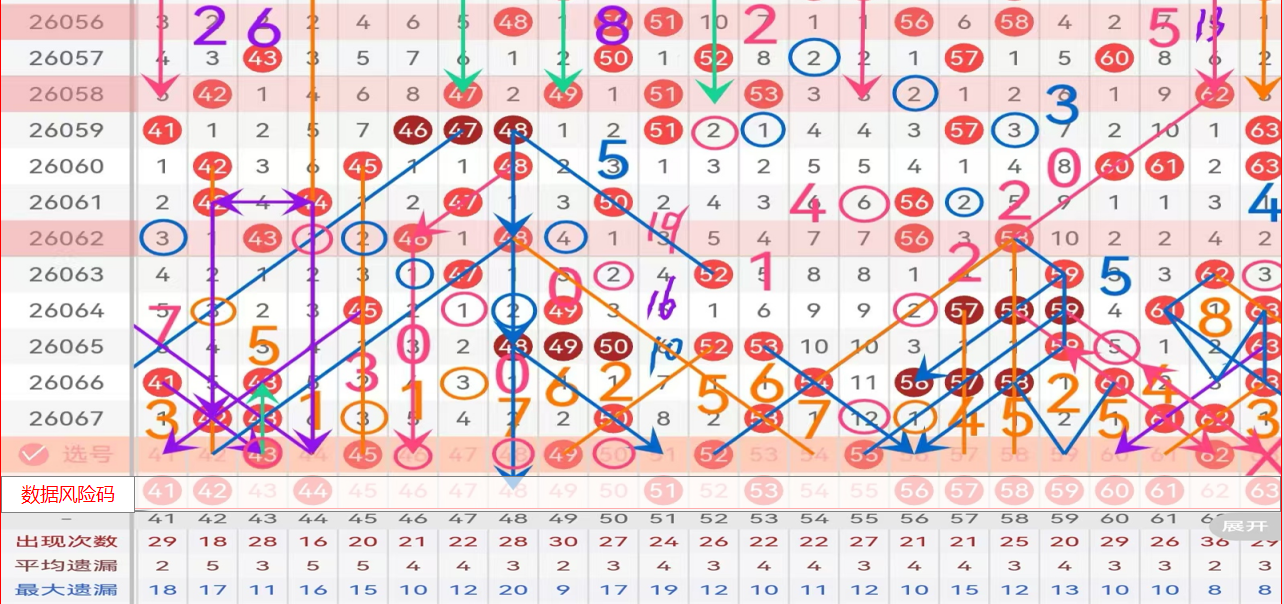 三区间上期出了4个号 码,温态开出;上期43孤码走重,本期三重必防,,45遗漏对称,百期值温态偏冷码,无脑做回补吧;空位三斜连的49,第七次走遗漏2点位,4字头尾部的46 47 48 49 50五码可做不错的拖码防守,五择一推荐49主防;斜连回首掏三斜连的52和上期的68同形态,小数据码,可做防,不宜高倍胆码;大遗漏11期值的55,百期值热态码,从百期最大遗漏6,到现在本期最大遗漏12,本期保持热态极高跟随数据,可考虑这个隔期跳空的三斜连码做回补主防;41 42 44 51 53 56 57 58 59 60风险码;