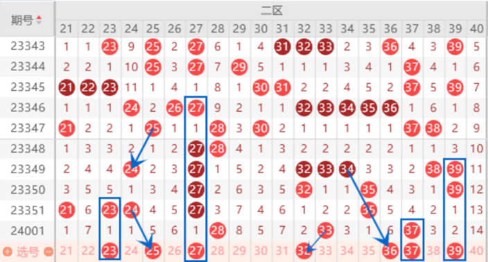 连号空一带号21 23 24号数字上期没能开出重号来,本期我们注意一下回补号码的情况。重点关注一下21 23号数字的回补的情况。本期的27号数字我们注意一下,属于重号空一对称号码,本期出号机会还是有的。本期的32号数字我们注意一下,上期开出了33号数字,有可能会把本期的32号数字带出来的。本期的36 39号数字我们注意一下,这里是有机会出一个号码的。