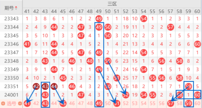 本期的43号数字本期我们注意一下走三重的情况。本期的45号数字我们可以防守一下出号情况的,毕竟是属于空三中心号,本期的空三中心号有三个号码,是有机会出一个号码的。本期的49号数字我们注意一下出号情况,本期的48号数字应该是要断号了,那么本期有可能是要出49号数字的。本期的51号数字我们做一下防守就行了,有点过于热了。本期的59号数字夹号,在尾数上看也是很好的,所以本期我们可以防守一下。