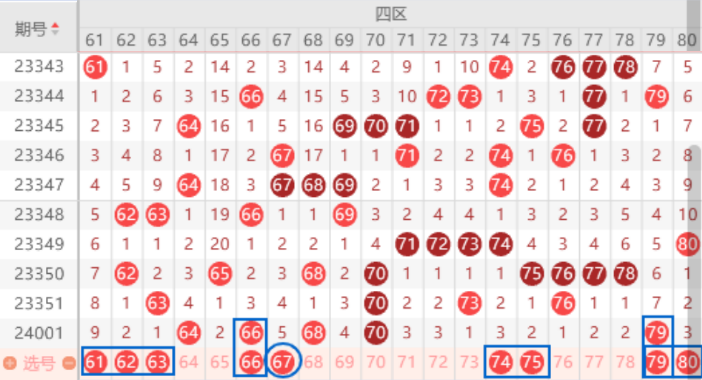 该区间的61 62 63号数字我们要注意出一个号码的情况。上期开出了64 66 68 70号数字,本期我们注意出一个重号一个夹号的情况,重号重点关注一下66 70号数字出重的情况。夹号重点关注一下65 67号数字的出号情况。本期的72 74号数字是属于交叉对称号码,本期是有机会出一个号码的,我们可以注意一下。本期的75号数字我们防守一下,出号机会还是有的。上期开出了79号数字,本期我们注意一下走重的情况,防守一下79 80号数字同出的情况。