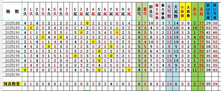 4、大号(41以上)数量:上期大号数量是 10 个,判断本期大号数量号码为 10 个,平分秋色;