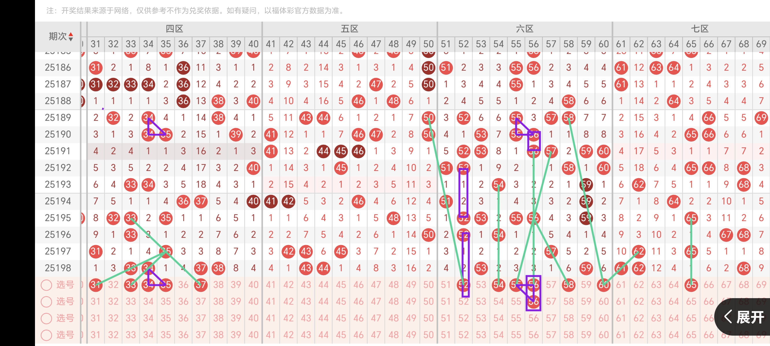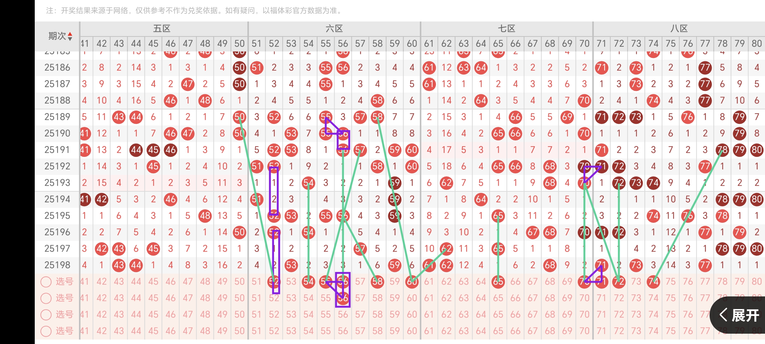 二、结合上面的数据及0头~7头前面几期出现的数量、1~10尾(0尾)出现的数量,以及一起彩APP走势图进行综合分析并选择20个号码如下: